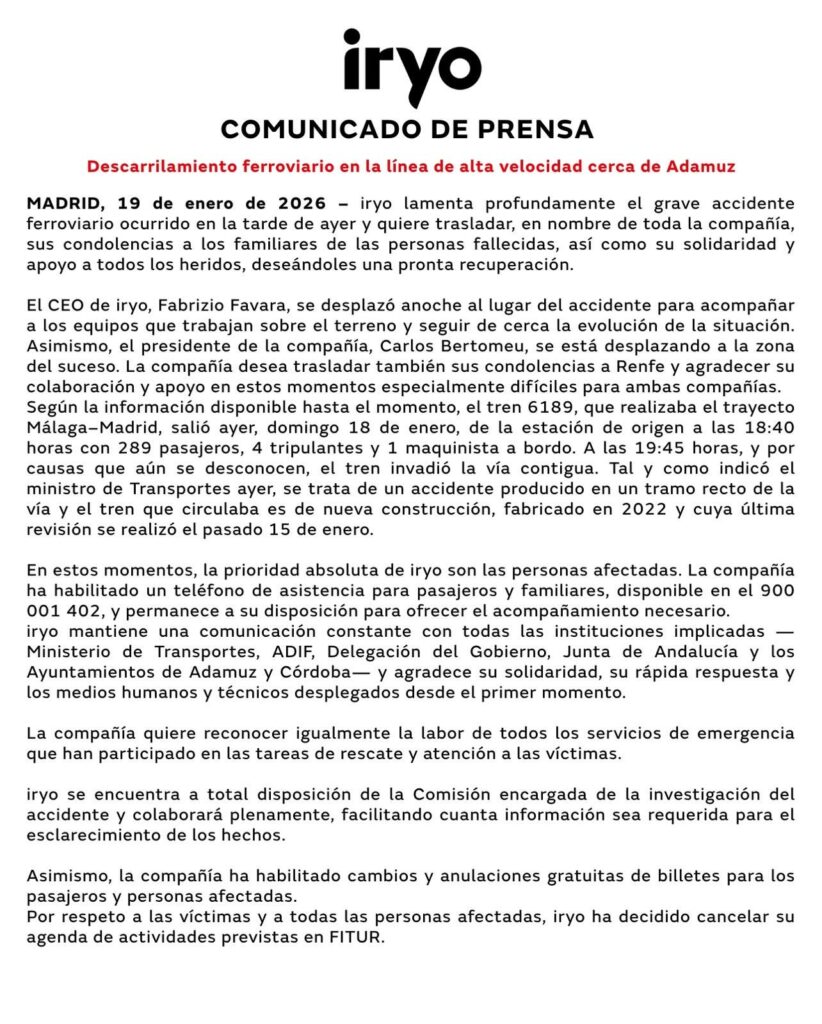 Comunicado oficial de Iryo tras el accidente de tren sufrido en Adamuz (Córdoba)